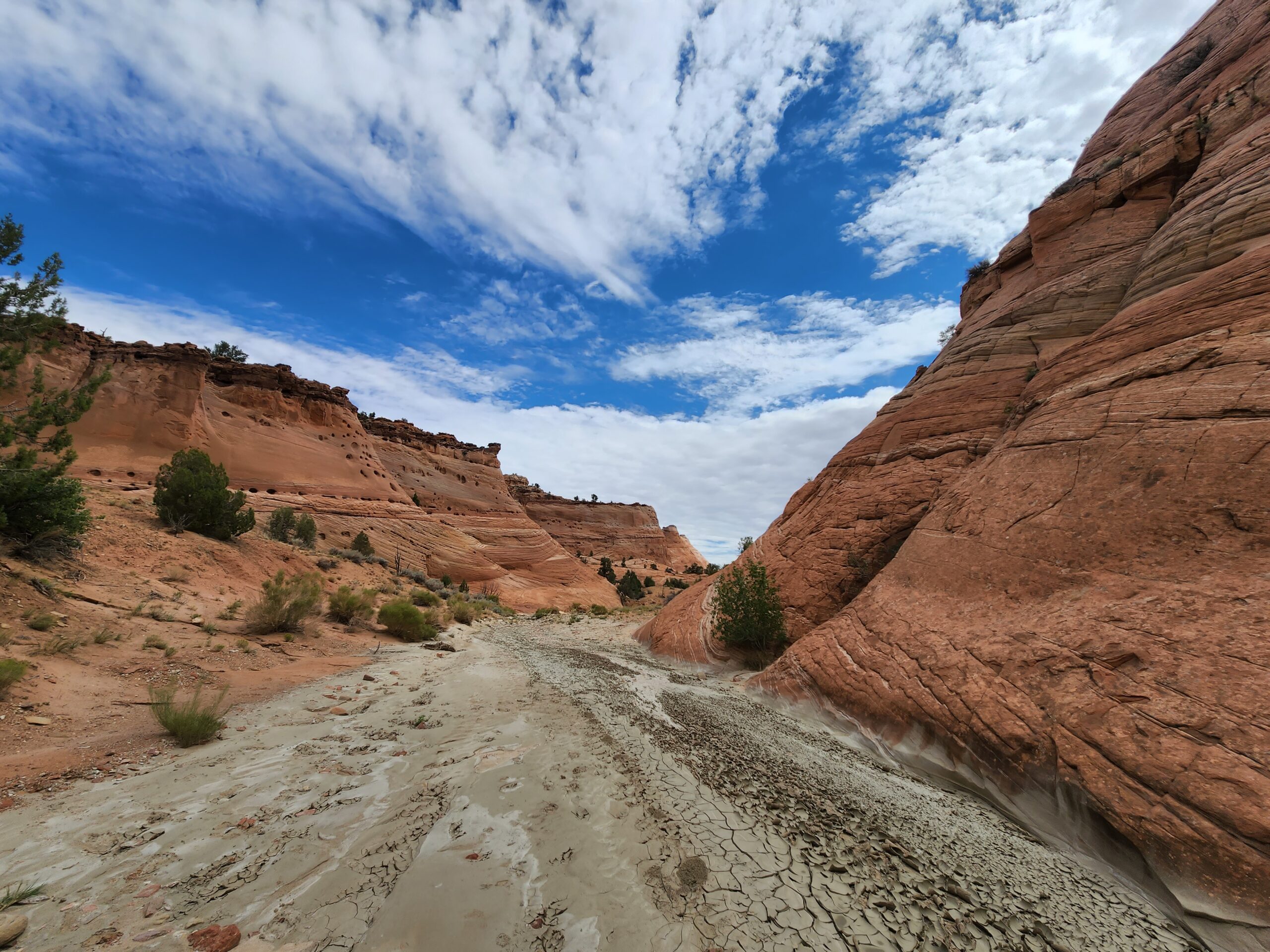 There’s beauty even here, though. The rock walls along the wash start subtle: soft reds, layers of horizontal bedding, and light that shifts across curves and shadow like a desert paintbrush.
