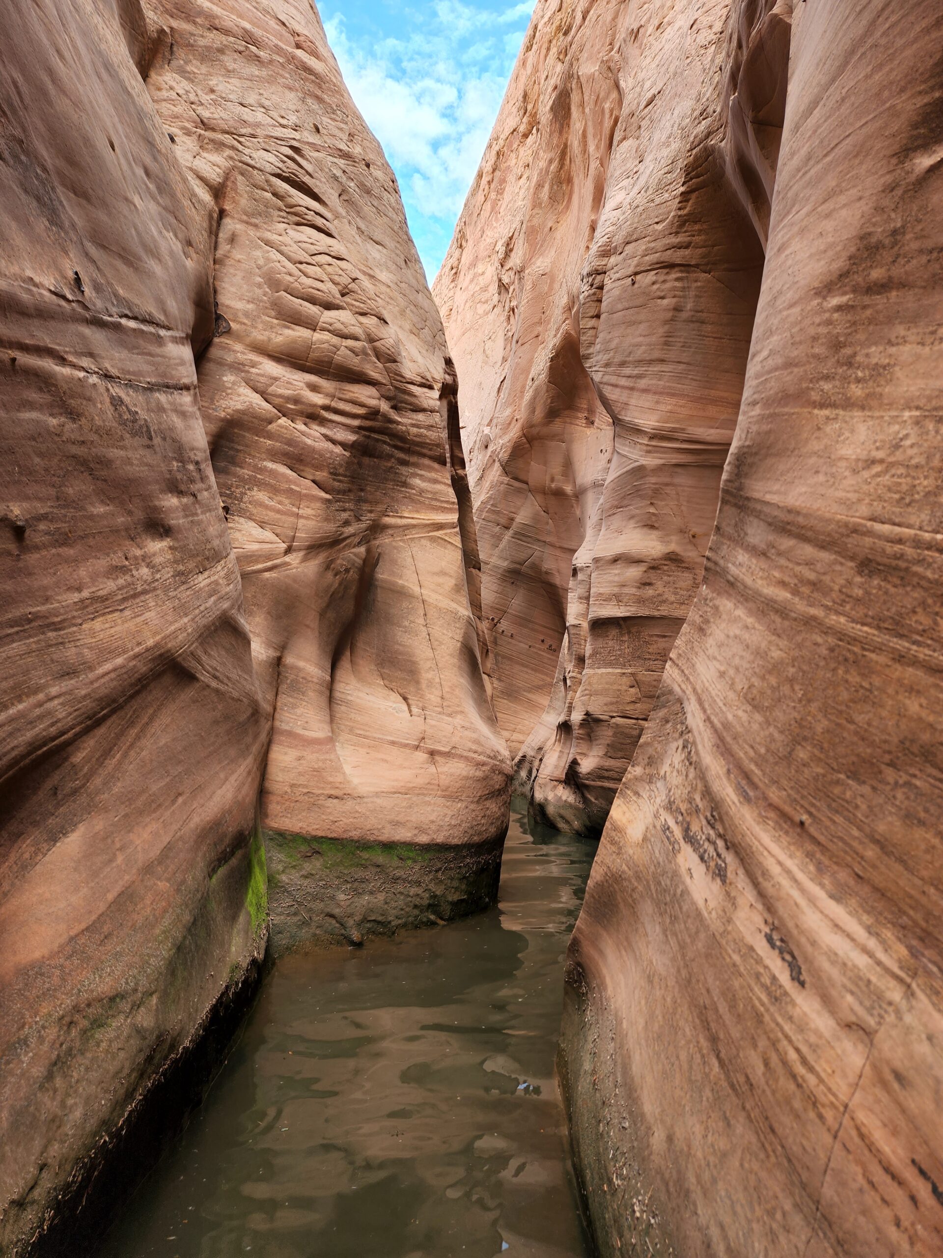 We slid off backpacks at the entrance — leaving packs back where they wouldn’t get soaked — and stepped into the cool, muddy water. The walls felt close enough to touch both at once in places. Penned sunlight danced where the stripes met shadow. It was just us and the stone.